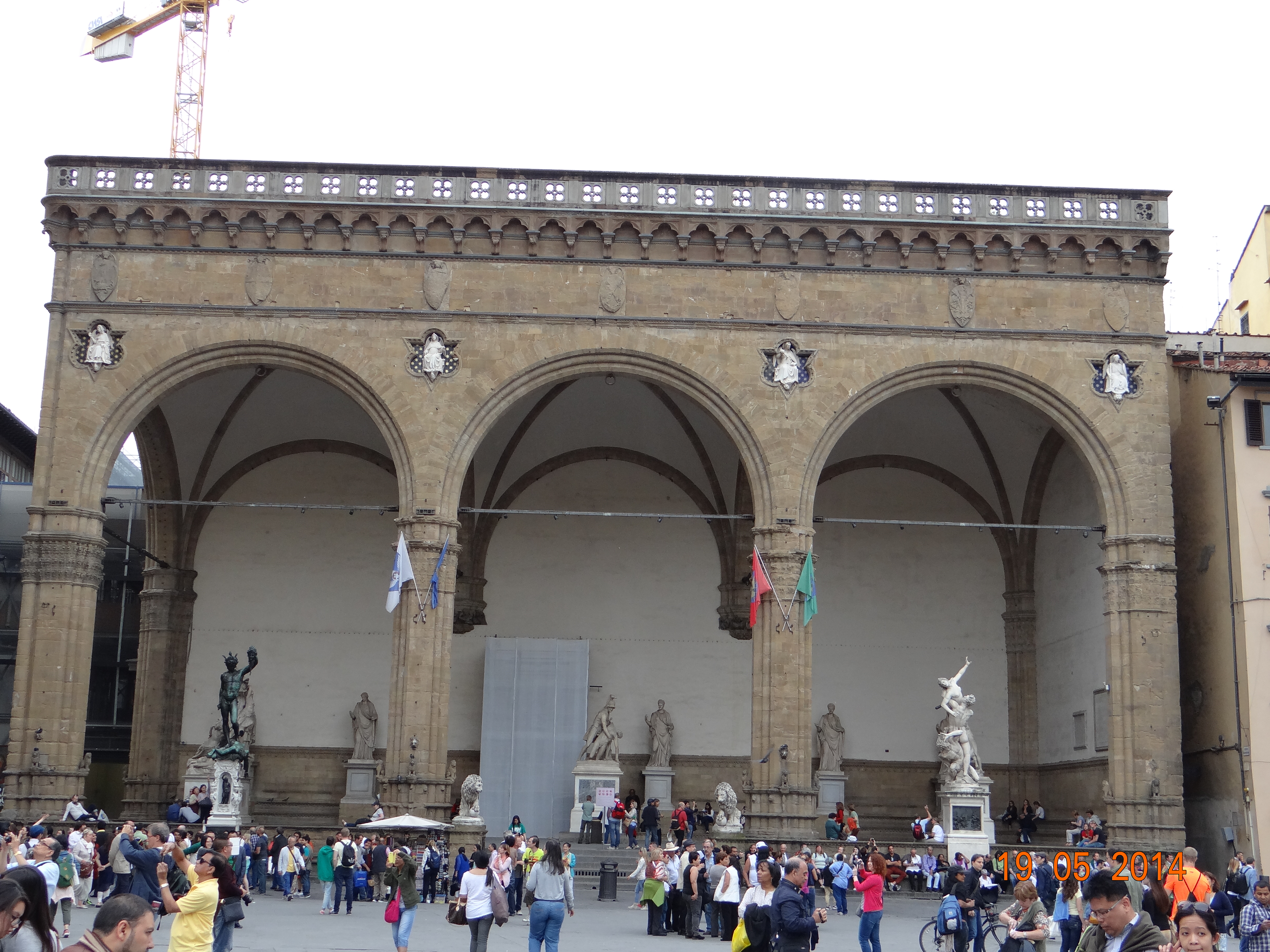 Sarayın önünde Grandük 1. Cosimo atının üstünde bize bakıyor. Hemen yanında Ammannati’nin eseri olan Neptün çeşmesi var. Sarayın kapı girişinde ise Hercules ve Cacus heykelleri yer alıyor. Sarayın sağ tarafındaki kemerli yapının içinde ise elinde canavar Medusa’nın kafası olan Cellini eseri Perseus heykeli, hemen yanında Michelangelo’nun ünlü Davud heykelinin kopyası, (orjinali Accademia’da) Loggia Dei Lanzi ve Sabin kadınlarının kaçırılmasını temsil eden Giambologna’nın ünlü heykeli yer alıyor.