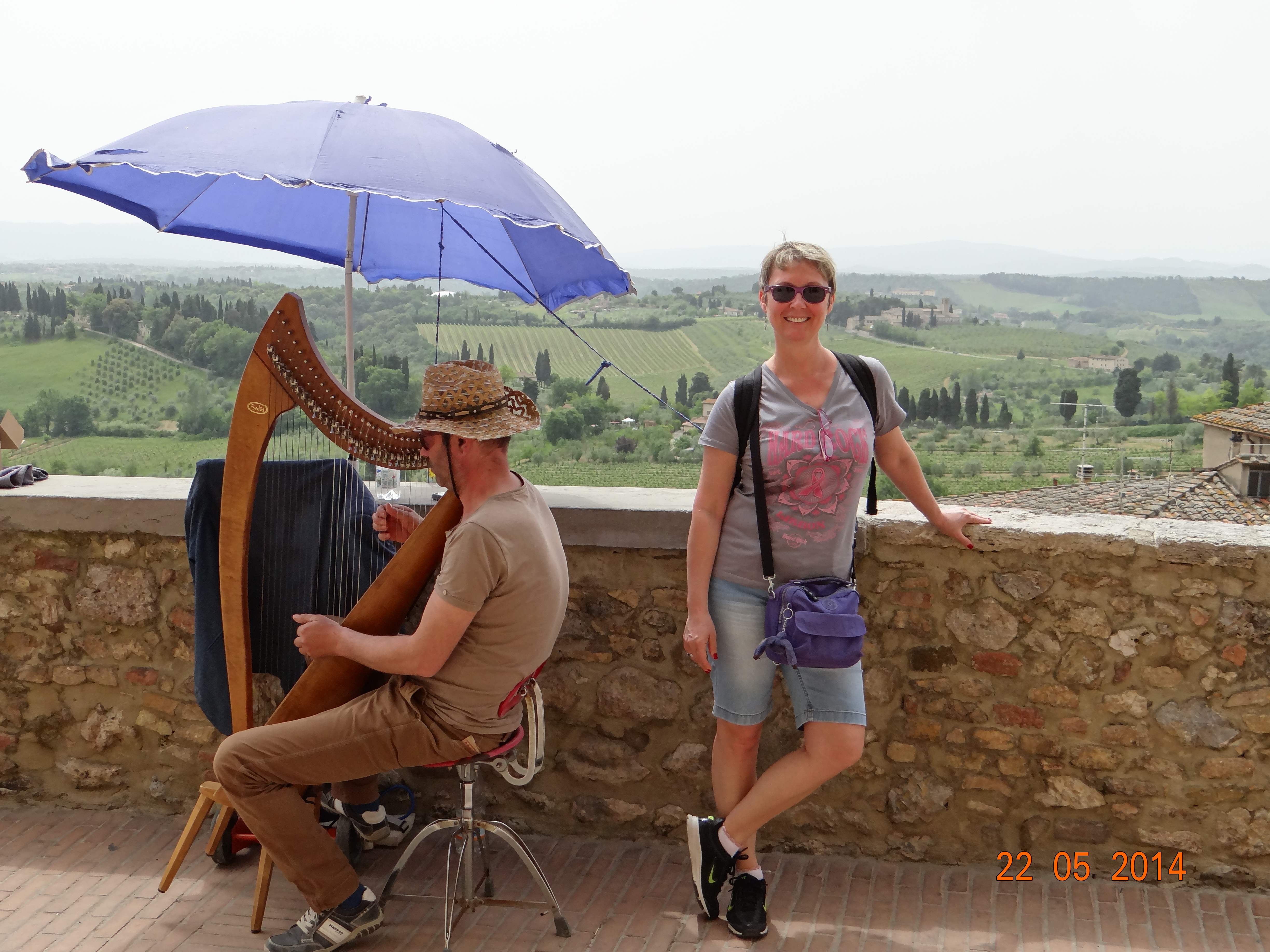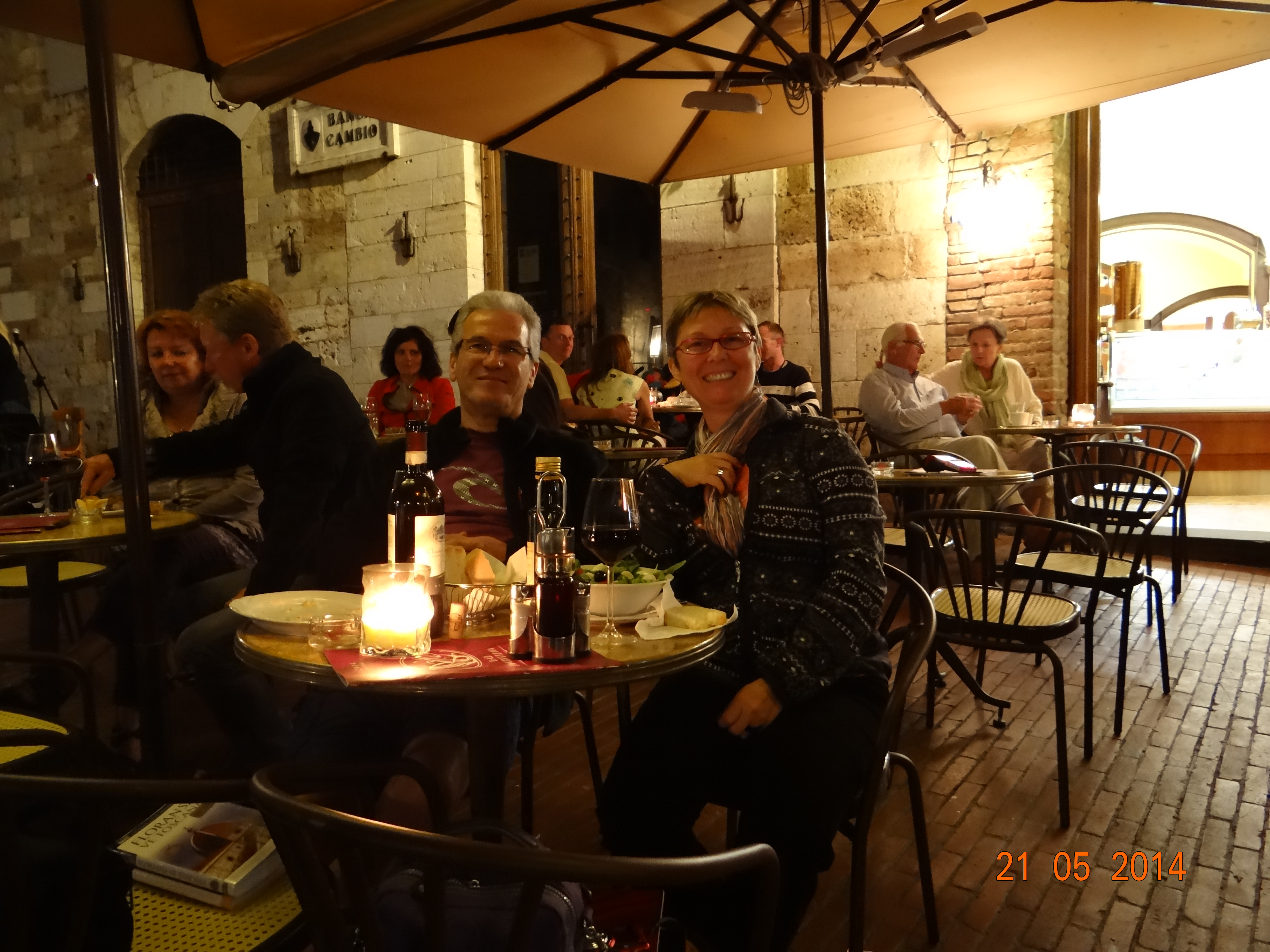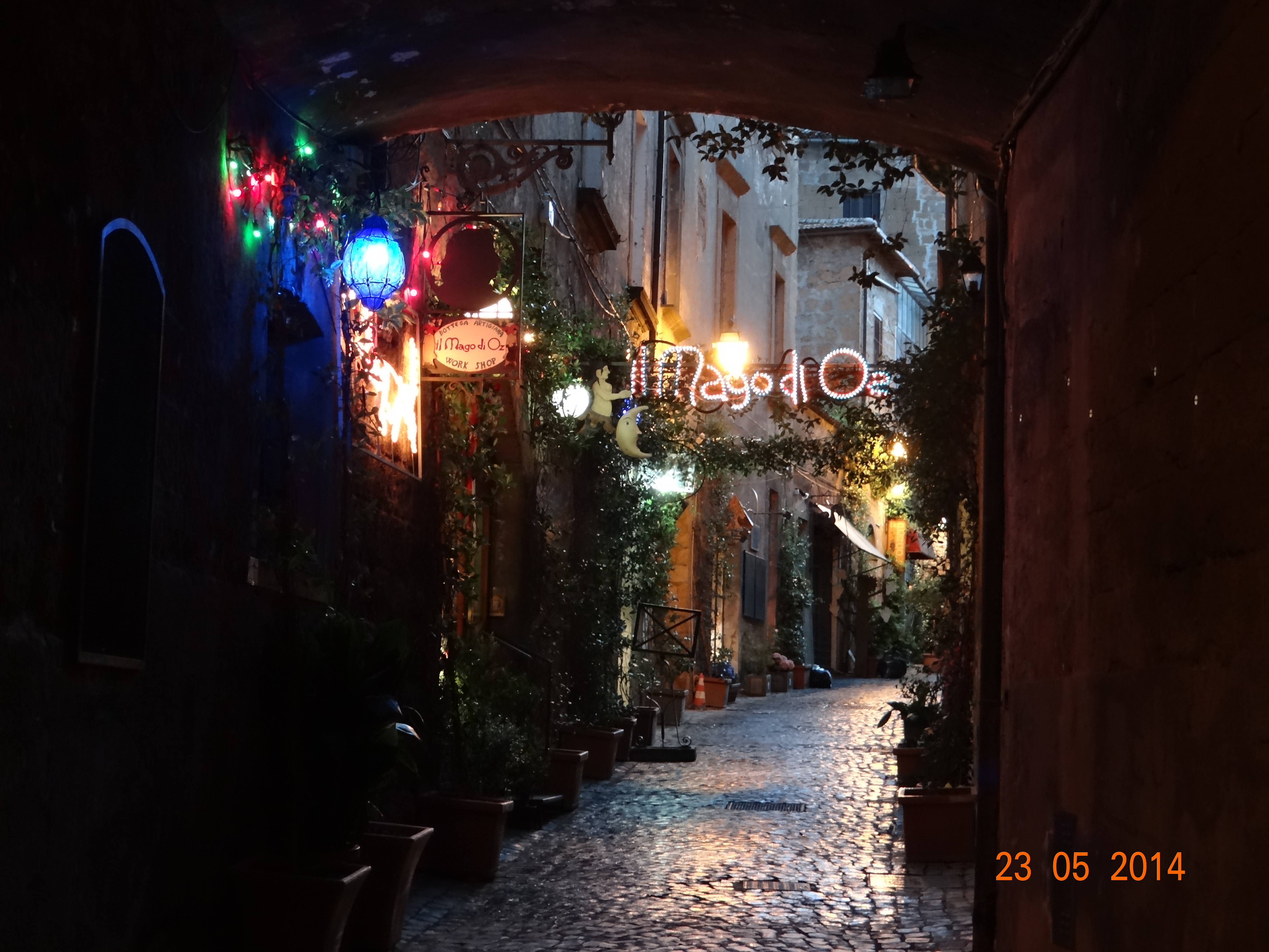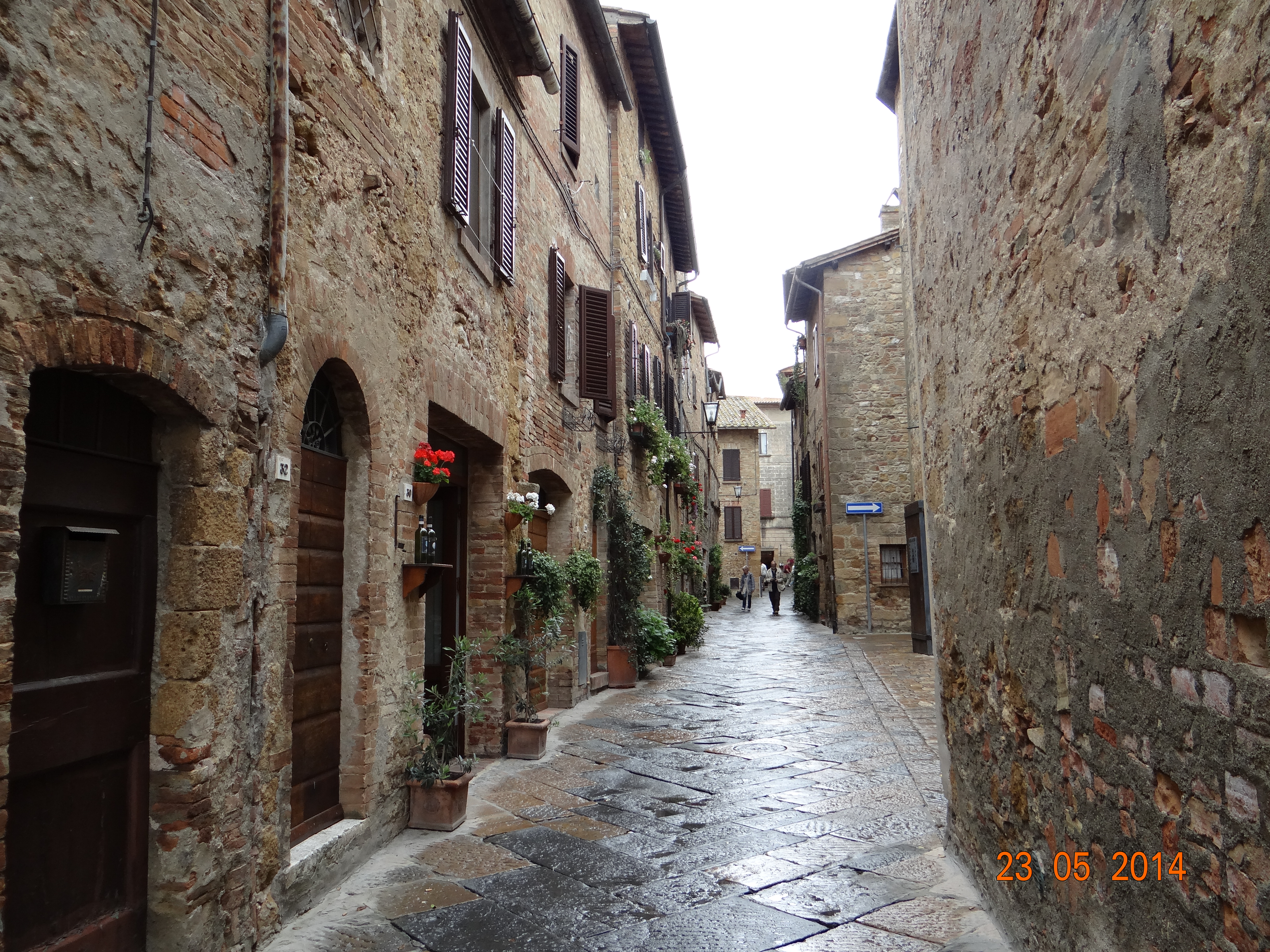 Şehrin tüm binaları taştan yapılmış ve boya kullanılmamış. Bu da hem tarihi yapının korunmasını hem de bina estetiğinin öne çıkmasını sağlamış. Meydandaki restaurant’a yerleşip günlerce hayalini kurduğumuz Chianti Classico’muzu sipariş ederek başlıyoruz geceye. Menümüz isli ya da kuru et ve sucuk, bir kaç peynir çeşidi, ekmek üstünde kızartılmış patlıcan üzerine dökülmüş eritilmiş peynir ve salatadan oluşuyor. Yemek sırasında bir de hemen arkamızda genç bir kadın arp çalmaya başlamaz mı ? Herhalde aşkım da bana katılır ki bu gezide yediğimiz en güzel akşam yemeği burasıydı. (Üstelik en ucuz. 45.-€) Bar La Cisterna Plazza adlı bu restaurantı hararetle tavsiye ederim.