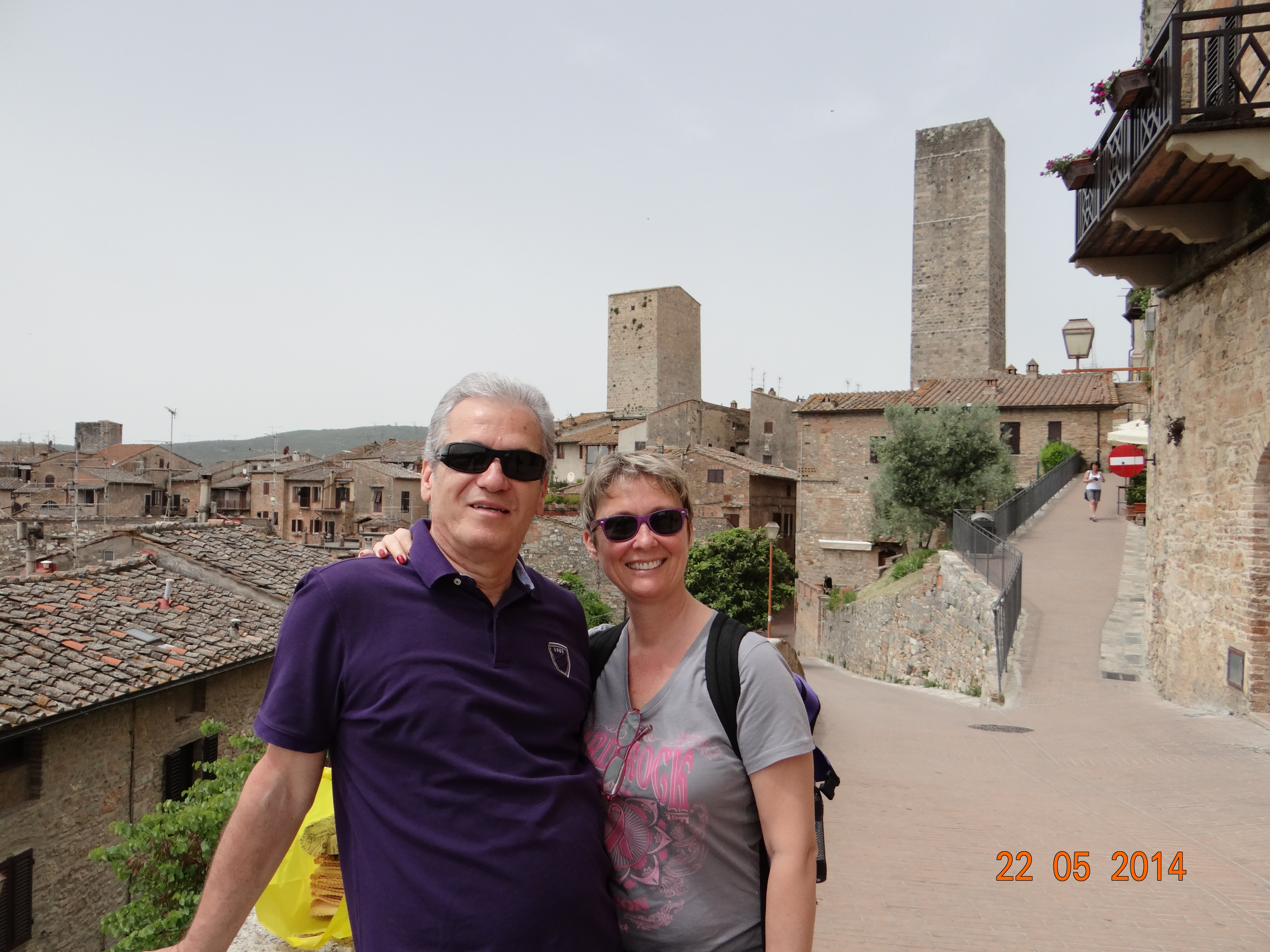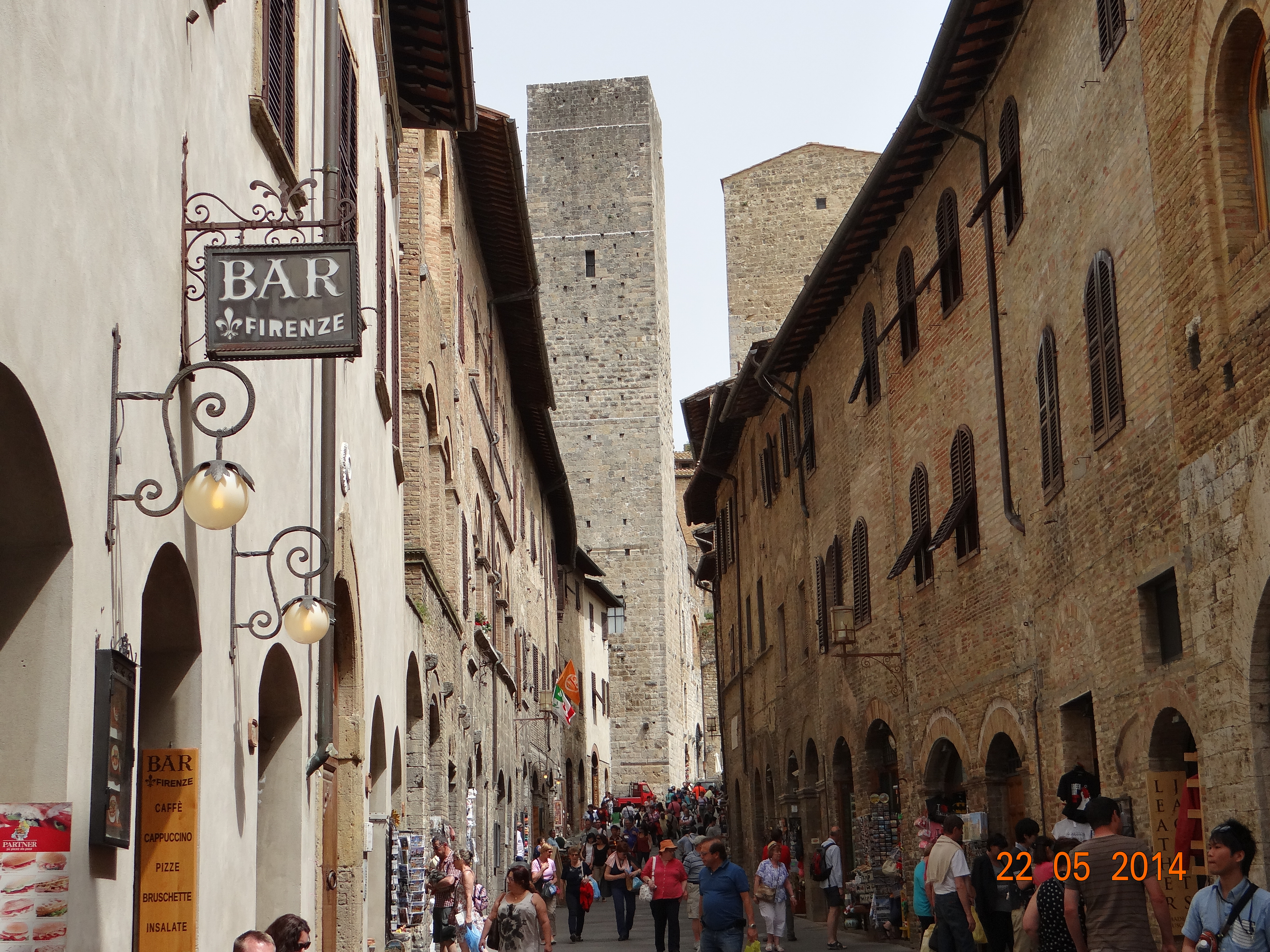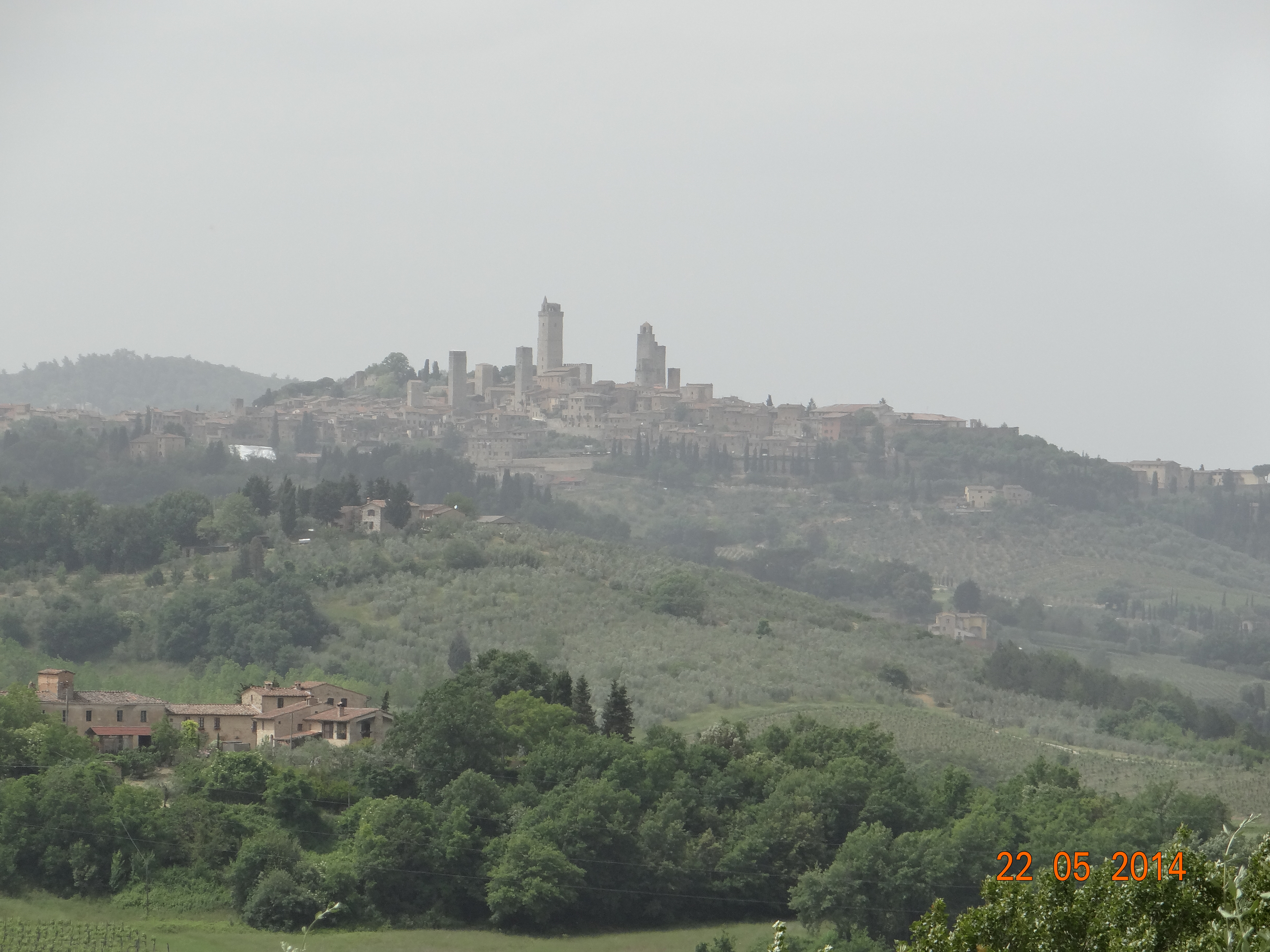 Çin’in Xian bölgesindeki meşhur terrakota askerlerden sonra buradaki her bir küçük evin içinde de topraktan yapılan heykellerle hiristiyanlığın hikayesinin anlatımını izliyoruz. Ortada görevli sempatik bir rahip ve bizden başka kimse olmayınca rahibin özel rehberliğinde gezmek keyifli oluyor. Gerçekten de Hz. İsa’nın hayat hikayesi sadece bu topraktan heykellerle müthiş başarılı bir şekilde anlatılmış. Her evcik de ayrı bir hikaye var. Rahip kilitli kapıyı açıyor, içeride hikayeyi anlatıyor ve çıkıyoruz. Kapı kilitleniyor ve sıradaki evde aynı hareket tekrarlanıyor. Bilinmeyen adeta saklı bir tarihi eser niteliğinde burası. 21 evin tamamını gezdikten ve rahip efendiye teşekkürlerimizden sonra arabamıza atlayıp rotamıza devam ediyoruz. Volterra’yı oyalanmadan pas geçip asıl en önemli ilk hedefimize ulaşmak amacındayız. San Gimignano önce uzaktan o benzersiz siluetini gösteriyor bize bu güzel havada. Akşam üstüne doğru da 11. Yüzyılda kurulduktan sonra 14 ve 15. Yüzyıllarda bugünkü görünümünü alan ve hakikaten görülmemesi büyük kayıp olan bu küçük sevimli şehre varıyoruz. Toscana bölgesindeki tüm tarihi şehirlerin merkezine araç sokulmuyor. Bu nedenle şehrin merkezine 300 m. mesafede yol üstündeki Belvedere hoteli seçiyor ve gecelik 80.-€ ‘ya anlaşıyoruz. Otelin otoparkının olması önemli bir konu. Odaya yerleştikten hemen sonra otel sahibinin tarif ettiği kestirme bir yoldan yürüyerek tam da güneş batarken ulaşıyoruz şehrin kalbine. Tarihi meydanın tam ortasında büyük bir kuyu, etrafında ise iki kuleli Torre Grosso ve tabii ki yine tarihi bir Duomo (Kilise) var.