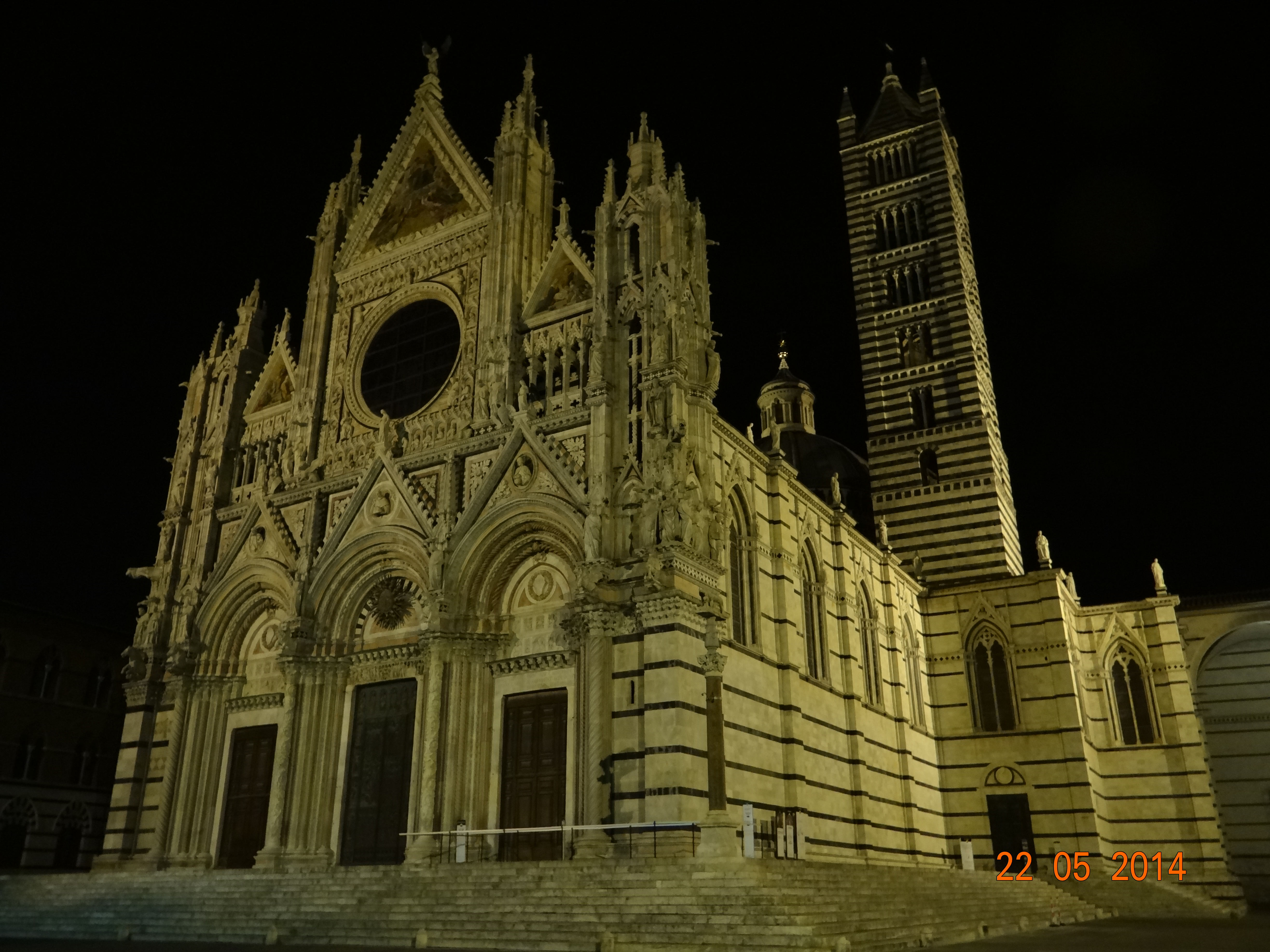 Öğleden sonra bu parkurdaki en büyük yerleşim merkezi olan Siena şehrine varıyoruz. Yine surlarla çevrili eski şehrin içine ancak bu bölgede oturan ya da iş sahibi olanlar girebiliyor ve uygun bir park yerini ancak bir iki turlamadan sonra bulabiliyoruz. Şimdi bize bir otel lazım. Ara yollardan tarihi bölgeye doğru yürüyünce karşımıza çıkan Hotel Excelsior’a dalıp doğrudan resepsiyona giderek yerleri olup olmadığını soruyoruz. Olumsuz yanıt vermekle birlikte bizi komşuları olan Hotel Chiusarelli’ye yönlendirmeyi de ihmal etmiyorlar. Bu otele geldiğimizde ise renöve edilmiş güzel bir tarihi bina buluyoruz karşımızda. Burada oda durumu uygun ve ücreti de normal. 110.-€ Otelde odamıza yerleştiğimizde arka cepheye bakan penceremizin Seri A takımlarından Siena F.C’nin stadyumuna bakan bir konumda olduğunu görüyoruz. Korsan bir maç izlemek için harika bir durum. 🙂 Otelle işimizi bitirdikten sonra hemen eski şehrin surlarından geçiyoruz içeriye. Şehrin hayata geçiş tarihi 1288. Yolumuz üzerinde güzel bir duomo var. Santa Maria Assunta. Bu son halini 15. Yüzyılda almış. Siena’nın kalbi ise İl Campo meydanında atıyor. Oldukça büyük bu meydanın tam cephesi Torre Dal Mangnia kulesi (14. Yüzyıl) ve yanındaki Palazzo Pubblico ile şekilleniyor. Her iki yapı da çok güzel. Ortasına doğru hafiften çukurlaşan meydanda bu yapıların karşısında ise restaurant ve bar’lar dizilmiş halde.