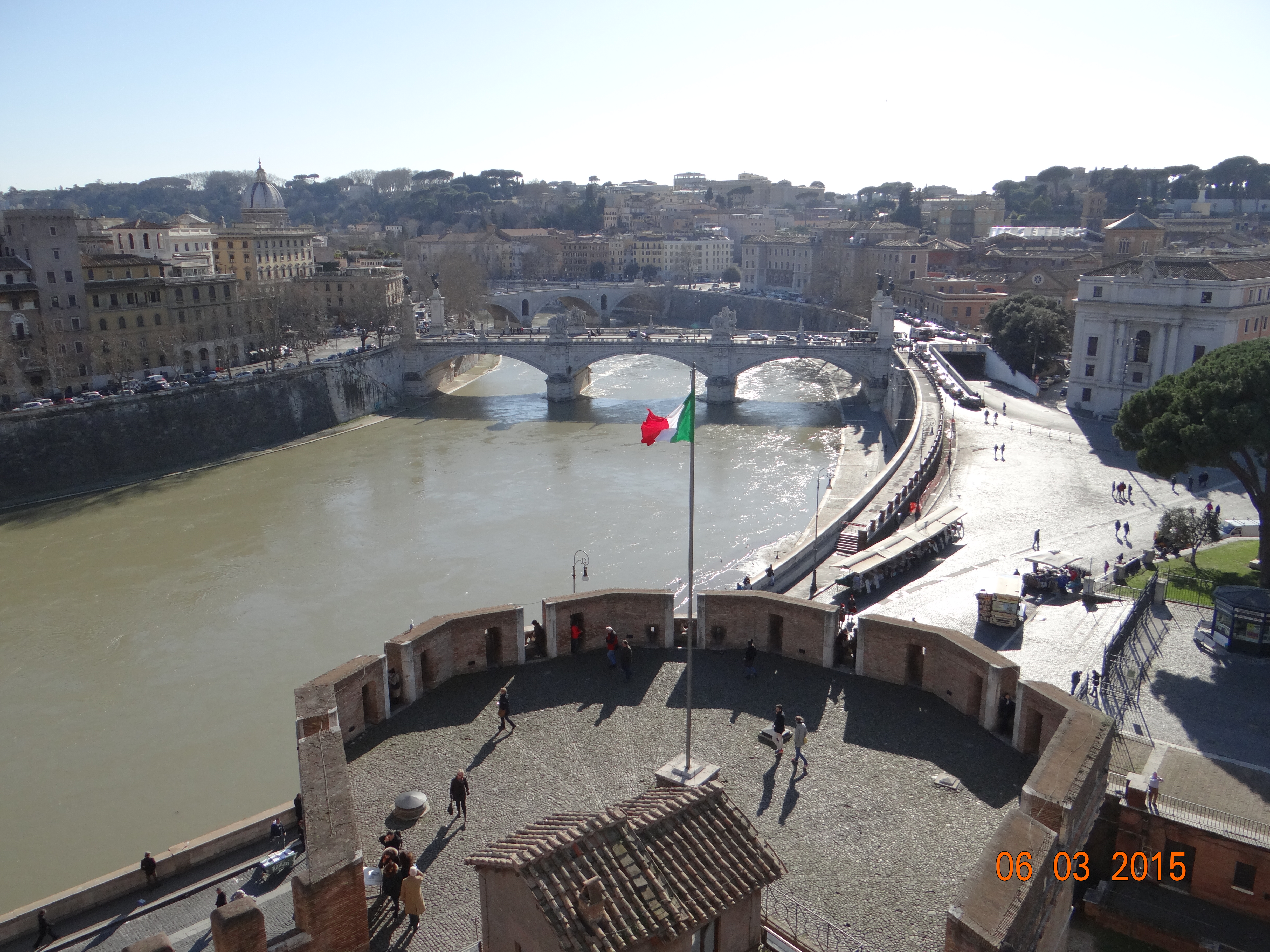 Kalenin burçlarından Tiber Nehri ve oldukça geniş Roma manzarası görülüyor.
