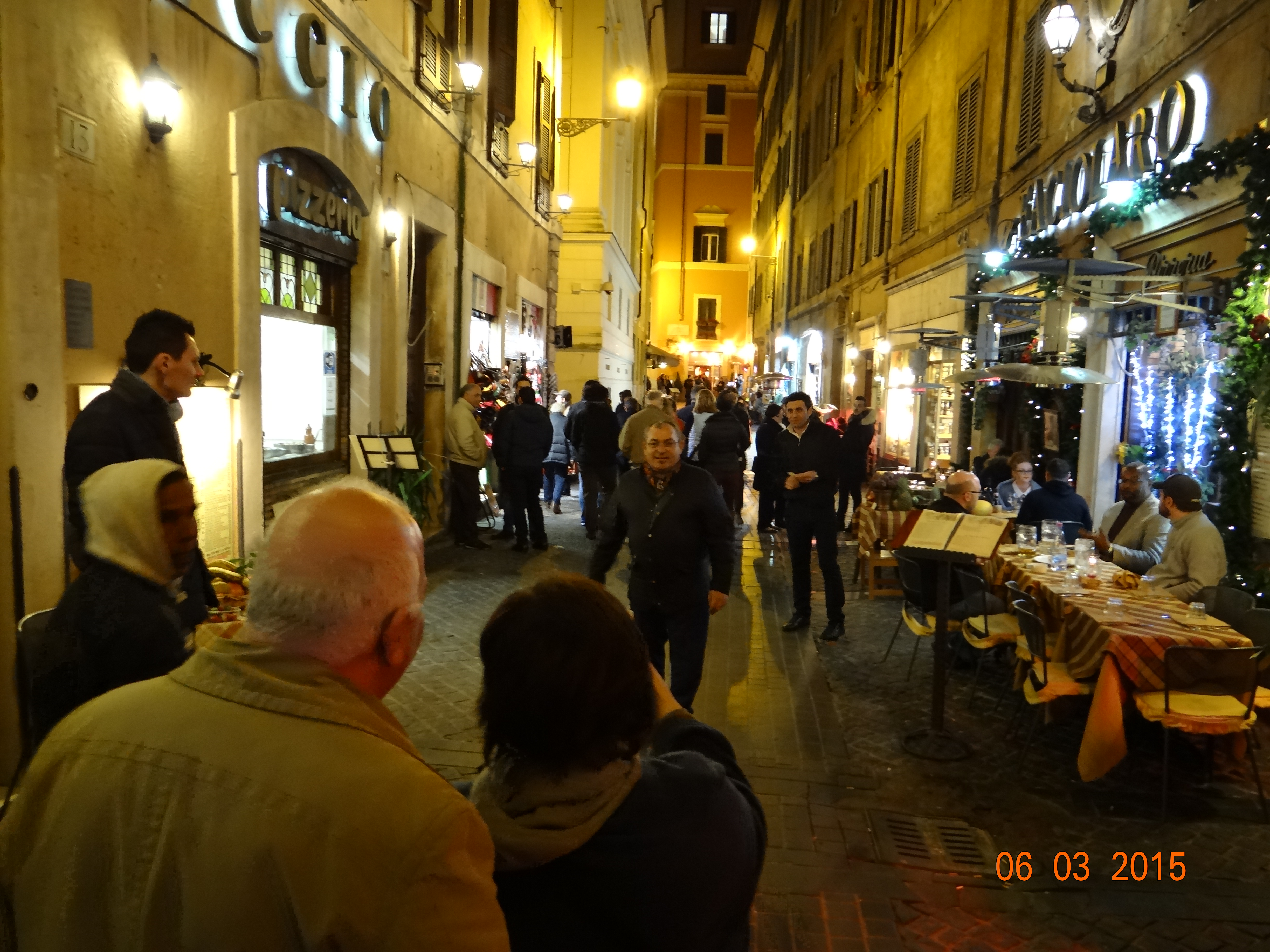 İspanyol merdivenlerinden inmeye başlayarak Roma gezimize de başlamış olduk. Merdivenler her zamanki gibi son derece hareketli. Merdivenlerin sonu alış verişiyle ünlü Via Del Corso caddesine çıkıyor. Bu caddeyi tamamen geçip, artık havanın da kararmasıyla geldiğimiz Piazza Del Popolo meydanına bakan Rosati Restaurant’ı gözümüze kestiriyoruz. İtayla demek yemek demek. 🙂 Güzel yemeğimize özlediğimiz Toscana şarabı Chianti Classico eşlik ediyor. Dominic Cumhuriyeti vatandaşı olduğunu öğrendiğimiz sevimli garsonumuz Juan’da yemeğin keyifli geçmesi için elinden geleni yapıyor. Belki de Roma’daki ilk yemek olduğundan biraz fazla kaçırıyoruz ama değiyor. Dönüşte yine bir Roma klasiği olan ünlü Aşk Çeşmesine de uğruyoruz (Fontana Di Trevi) ama çeşme uzun süredir restorasyonda ve etrafı çevrili boş bir halde olunca, pek bir seyri de olmuyor.