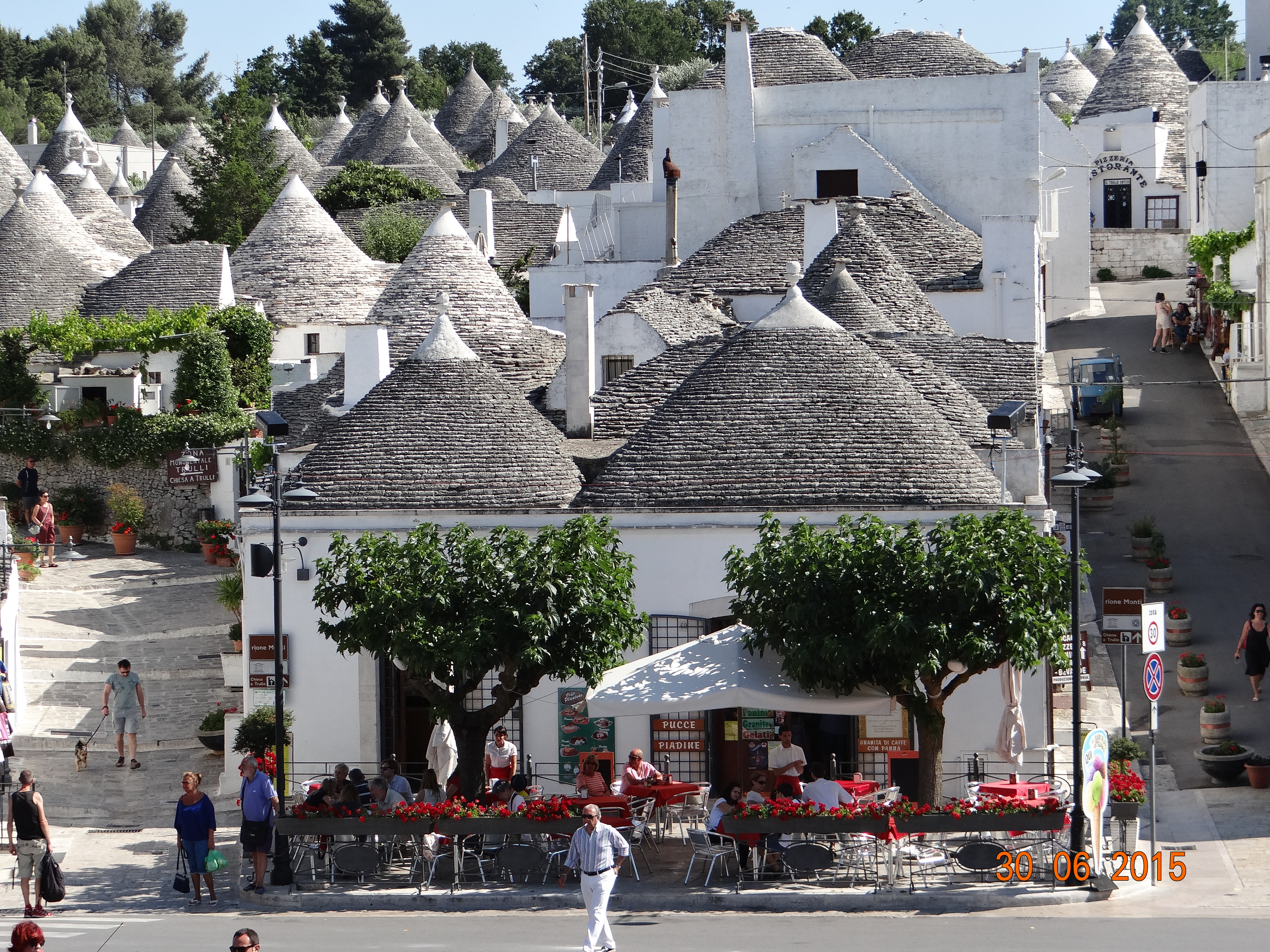 Halkı çoğunlukla çiftçi olan Alberobello sakinleri bu beyaz badanalı evlerini gri konik çatılarıyla spiral bir plan üzerinde, bu bölgeye ait küçük kireç taşlarını harç uygulamadan üst üste koyarak inşa etmişler. Geçmişi 16. Yüzyıla kadar dayanan bu evlerin yapı tekniğinin orta doğudan geldiğine dair bir görüş var. Gerçekten de çok daha eski bir tarihe sahip olan Harran bölgesindeki evler akla gelmiyor değil. 11.000 kişilik bir nüfustan ibaret olan Alberobello’nun adının anlamı “Güzel Ağaç” imiş. Evlerin bir kısmı hala kullanılıyor, bir kısmı dükkana dönüşmüş.