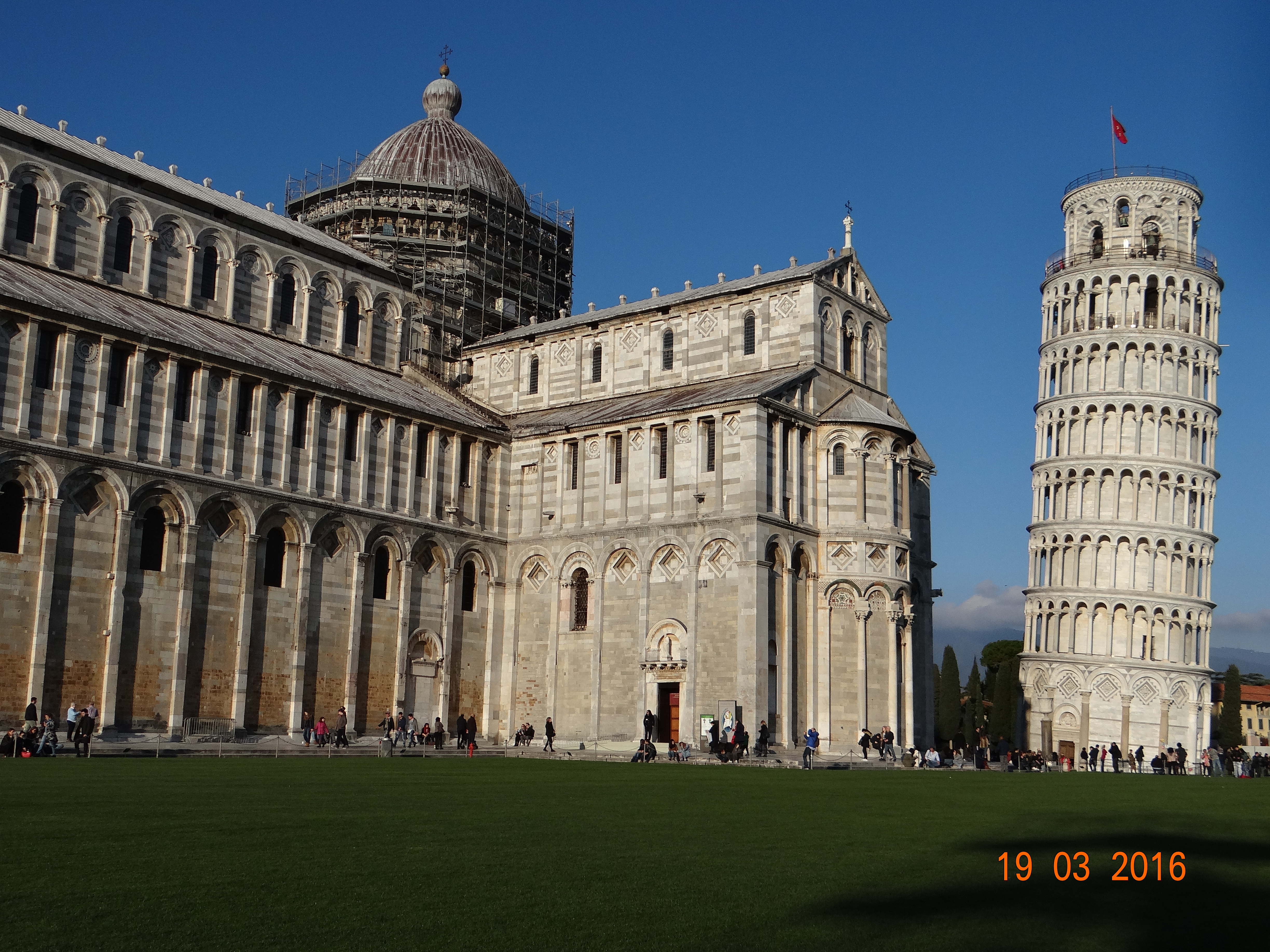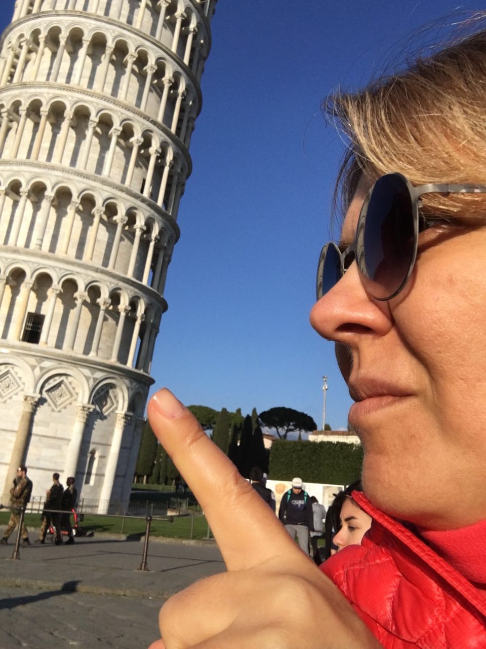 Kulenin yana doğru yatış hikayesi ise zemininden kaynaklanan bir sorundan ötürü. İlerleyen yıllarda bu yatışın engellenmesi için bir hayli uğraş verilmiş ve sonrasında da zemine yapılan müdahaleler ile bu sorun giderilmiş. Yine de bir seferde en faza 30 kişinin kuleye çıkmasına izin veriliyor. Klasik bir fotoğraf alanı olan bu bölgede düşen kuleyi tutma, ya da parmağıyla itme temalı muhtelif pozları verirken ilginç bir ana denk geliyoruz.