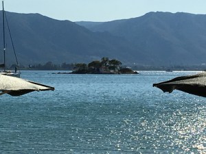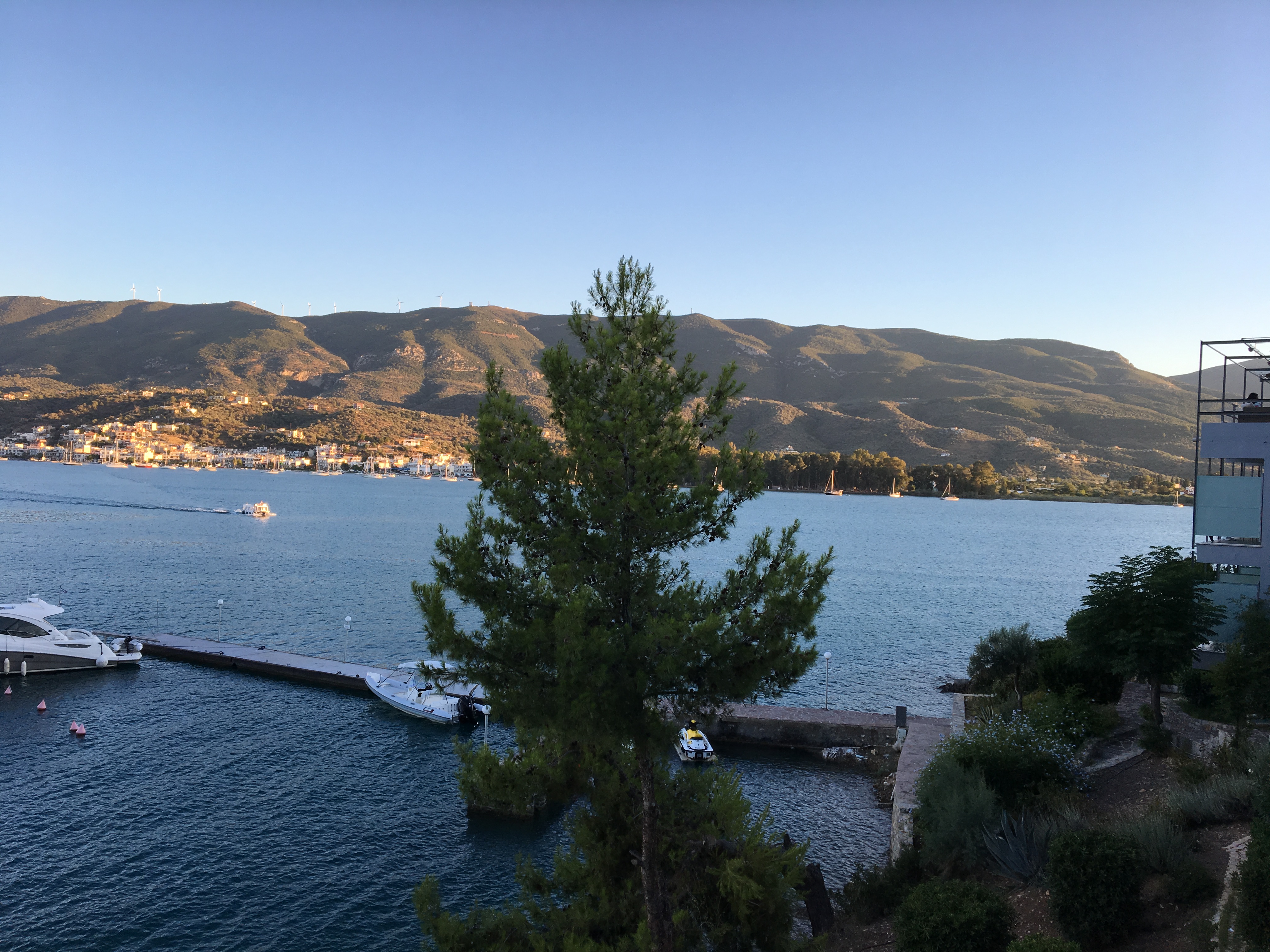 Pekala, tatildeyiz ve bu gerginlikten kendimizi kurtarmamız şart deyip sakinleşmeye çalışıyoruz yol boyunca. Allah’tan yolculuk süresi 1 saat. Sonunda tekne bizi küçücük bir adaya getirip bırakıyor. Çıkışta bir taksi yakalayıp otelimizin adını söylüyoruz. Xenia Poros İmage Otel’e rezervasyonumuzu aylar öncesinden booking.com üzerinden yapmıştım. 10 dakikada varıyoruz otele ve taksiye de 5.-€ ödüyoruz. Otelimiz karşılamadan yolcu edişe kadar geçirdiğimiz 9 gün boyunca tam not aldı bizden. Konumu şahane, hele akşam üstü güneşi üzerine alan Poros şehrini tam karşıdan izleten yönüne bayıldık. Çam ormanı içerisine çevreye en az zarar verecek şekilde konumlandırılan otelin deniz manzaralı odaları şahane.
