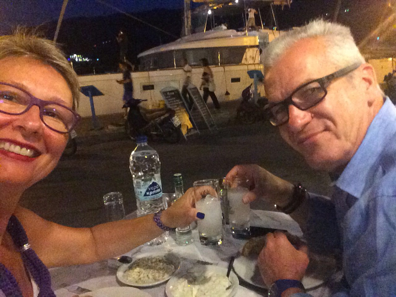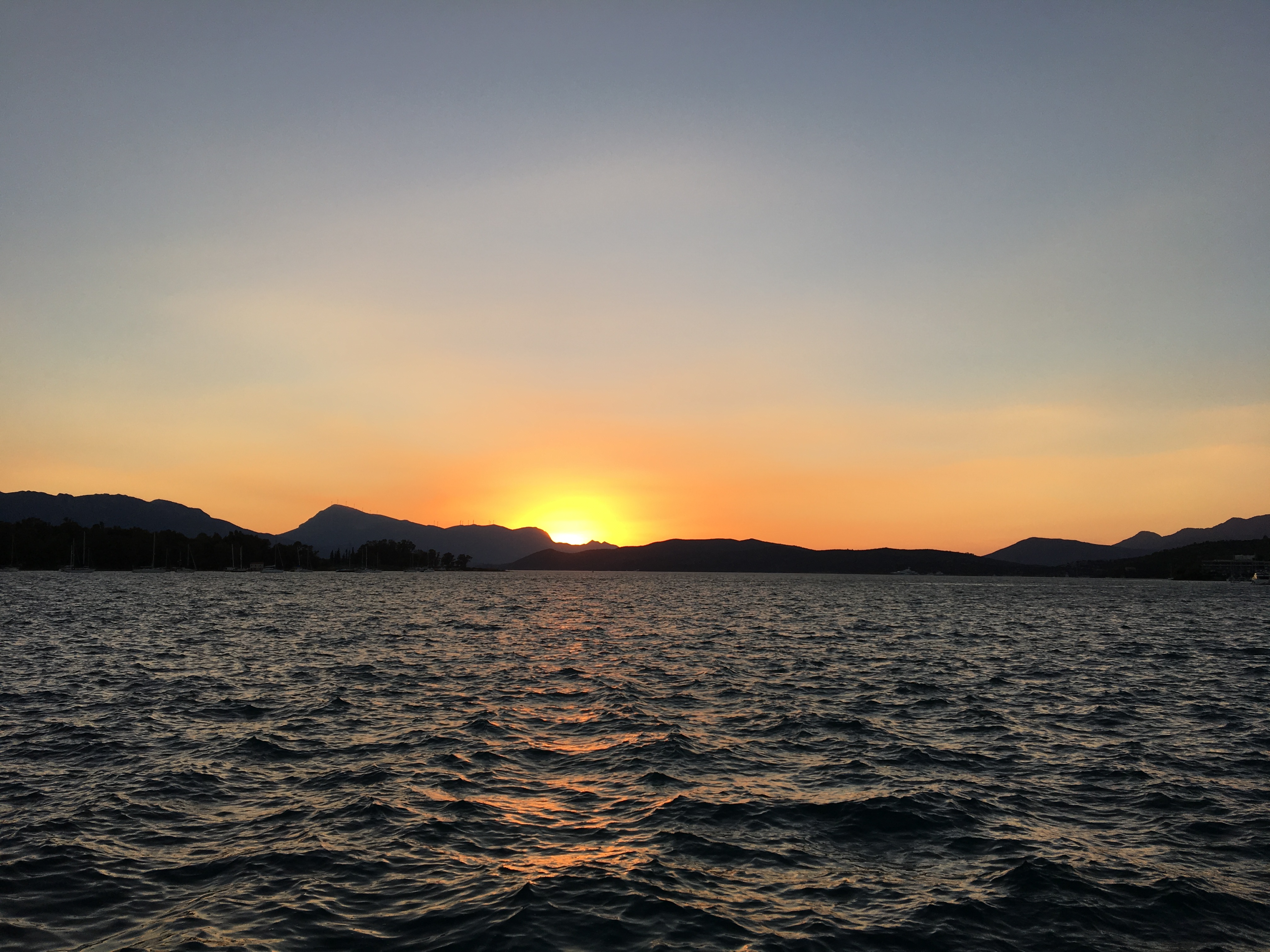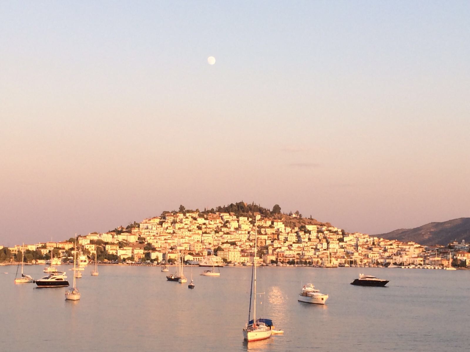 Şehrin hemen bizdeki boğaz mesafesinde ana kara üzerindeki Galatas’a motorla 5 dk.’da geçmeniz mümkün ücreti de 1.-€. Yemek sonrası hareketli bir kaç tane bar ve kulüp de gözlemledik. Akşam gün batımı bir başka güzel şehirde.