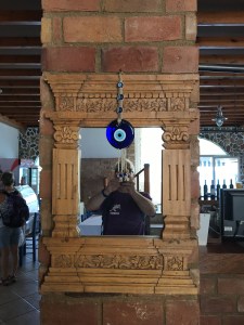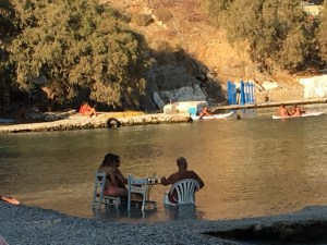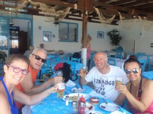 Bu gezimizin ilk 3 gününde aşkımla baş başayız. Son 5 günde ise sevgili dünürlerim Figen ve Mustafa bize katılacaklar. Bu nedenle ada gezi programlarımızı son 5 güne bırakıp ilk üç günü Melitsaxsa Beach’in ve Kouzina Restaurant’ın keyfini sürerek geçirdik. Manolis’in ekibi Judie, Vladimir ve Tatyana’dan oluşuyor. Her birisi ayrı ayrı harika insanlar. Kouzina’yı o kadar sevdik ki, Figen’i arayıp bir nazarlık getirmesini istedim kendisinden. Sağ olsun çok güzel bir nazarlık seçip getirmiş, hemen hediye ettik Manolis’e, o da anında restaurantın girişindeki sütun üzerine taktı hemen.