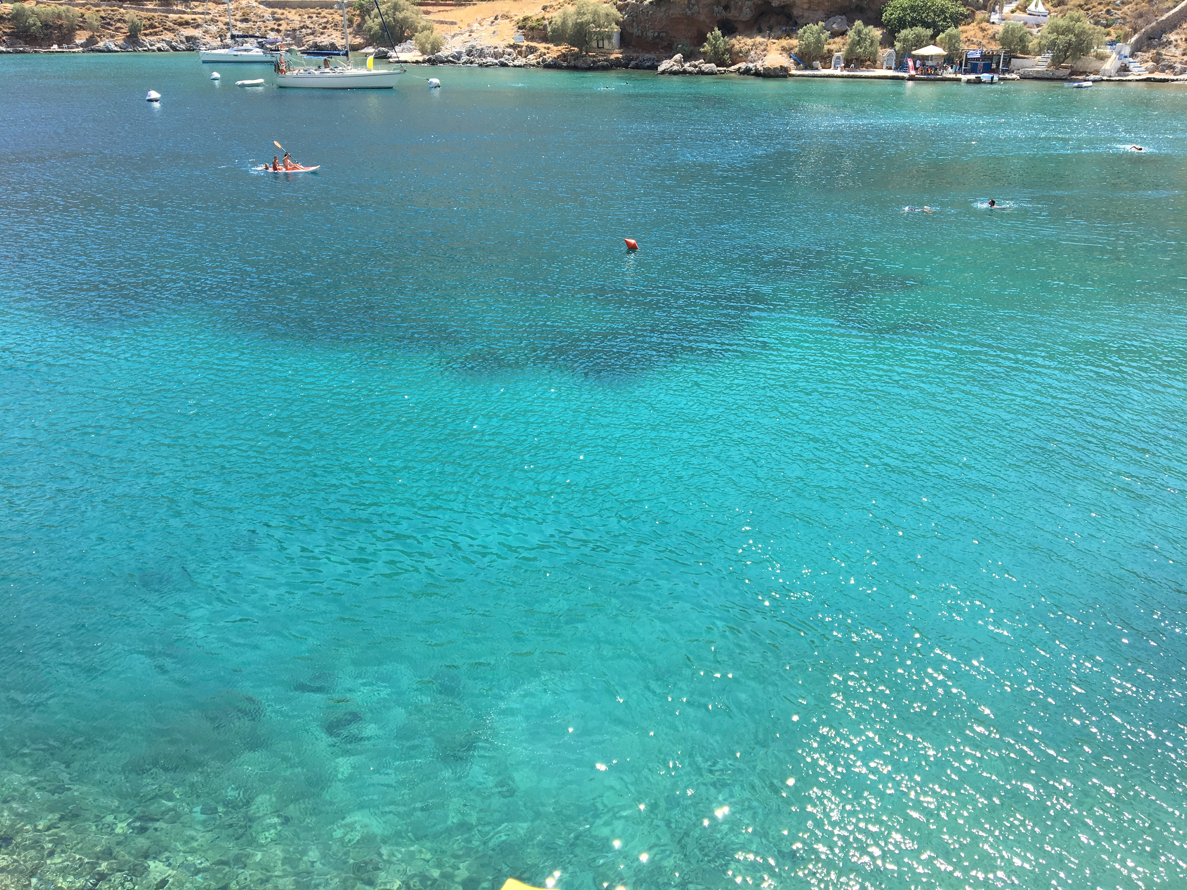 Bu cennet koyun sakinliği çevrede hiç bir yerleşimin olmayıp sadece 3 adet restaurant’a sahip olmasında yatıyor. Bağıran, çağıran, yüksek müzik gibi gereksizliklerden uzak koyda demirli yatların çokluğu zaten burası hakkında fikir veriyor yeterince. Deniz limonata tadında ve daha girişten itibaren binlerce balık en küçüğünden en büyüğüne sizi karşılamaya hazır bekliyor. Turkuvaz renkli ve tam bir göl havasındaki denizde bol bol şnorkel yaptık. Şnorkel sevenler için bulunmaz bir yer gerçekten de Panionisos Bay.
